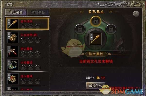 2、单件装备每打开一个铭文槽位,所需材料的代价都会变大,开启第一个槽位所消耗的材料为5万传奇币,第二个槽位为1个打孔石,开启第三个槽位则要3个打孔石。