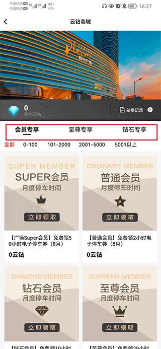 二、在会员、至尊、钻石专享界面中,选择你要领取的停车券
