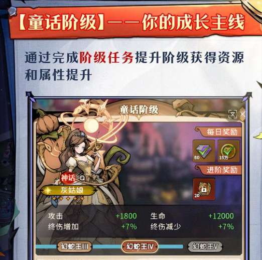 童话阶级是核心的成长线,这就是贯穿游戏的主线,在完成阶级任务之后,可以解锁属性加成,以及大量的资源。灰姑娘阶级可以带来12,000生命基础提升1800攻击,还有7%的中伤增减使用效果。后续再进阶到幻蛇王系列之后,就可以解锁更多的属性buff。日常别忘记要领80点活跃度,还会有对应的15万奖励,在进阶奖励的属性加成,那更是战斗力提升的关键,例如通关17-5的冒险关卡中,玩家就可以拿到300攻击。任意蟒族技能提升到180级,还可以额外的增加0.5%的终极伤害。