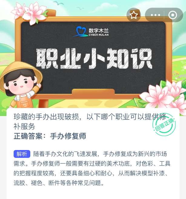 软件提交 专题合集 热门手游珍藏的手办出现破损,以下哪个职业可以提供修补服务?【蚂蚁新村每日一题】2025年10月16日题目已发布!坚持答题,积累木兰币,即可加速小镇建设。答对本题,立即可享“产速+3/时”的加速奖励!今天正确答案是【手办修复师】。珍藏的手办出现破损时,手办修复师可以提供专业修补服务。