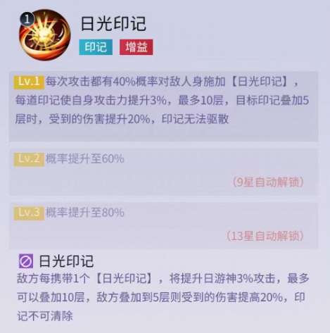 第二个技能属于自身的普攻,可随机伤害三个目标,比较中庸的技能。被动也是提升攻击力、生命值和治疗效果。大招在每次攻击时,都有几率给敌人身上施加日光印记,每到印记可以增加自身3%攻击力,最多叠加10层。目标身上的印记叠加5层时,受到的伤害提升20%。这个技能效果提升自身攻击力也就增加了治疗的能力,提高对方受到的伤害,也就辅助我方更好的输出,所以这个治疗在战斗方面还是比较全面的。