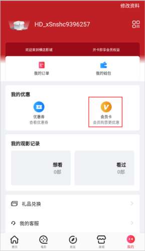 1、进到横店电影城app,在我的界面点击“会员卡”