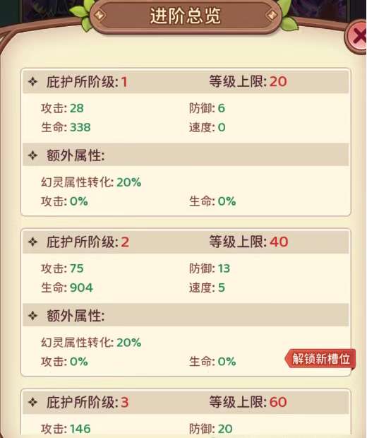 2.进阶收益:获得基础属性,达到指定阶数时还可以提升幻灵属性转化率和攻击/生命百分比属性加成。到达对应等级时会解锁上阵幻灵槽位。
