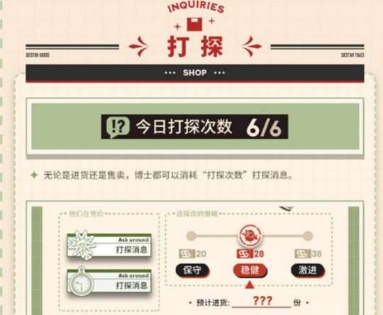 在每天营业时,“打探次数”将会被重置回上限。