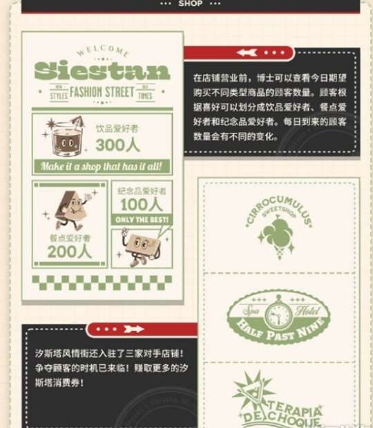 汐斯塔风情街现在有三家对手店铺入驻了,这意味着竞争的时机已经到来,大家要竞相争夺顾客。赢得更多的汐斯塔消费券!