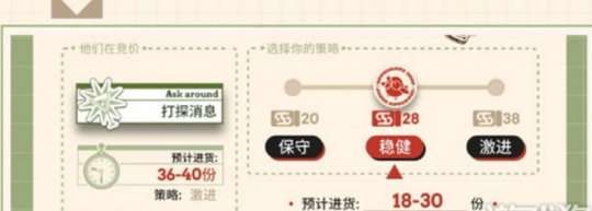 在进货时,博士需要选择价格策略,可选的策略有保守、稳健、激进三种,每种策略对应不同的商品进货单价。如果选择更高的价格进货,可以获得更多货物,但也会耗费更多的汐斯塔消费券。其他店铺也可以选择相同的三种价格策略。