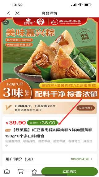 3、商品详情板块,展示舒芙里嘉兴粽信息,标注价格会员价及用户评价,提供立即购买入口,呈现产品详情与购买功能内容。