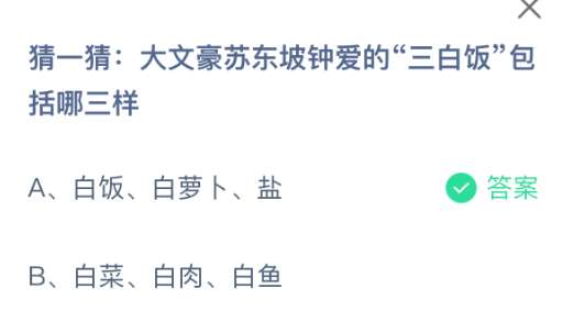 以上就是猜一猜:大文豪苏东坡钟爱的“三白饭”包括哪三样,支付宝蚂蚁庄园2025年10月3日答案最新,更多精彩内容,请点击关注pk游戏网更新!