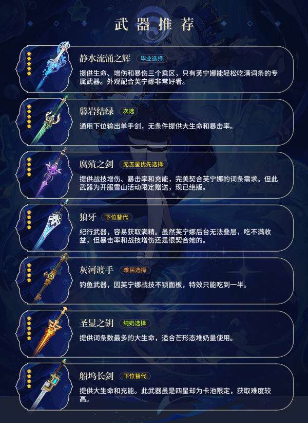 「芙宁娜」拥有丰富的武器选择。其中,与「芙宁娜」伴生的专属武器【静水流涌之辉】不仅外观美丽,特效也很突出。由于「芙宁娜」的生命值较低,存在一定的充能缺口,因此不建议选择另一款武器池中的伴跑武器【碧落之珑】,其强度低于专属武器,建议优先选择提升命座提升的方式。