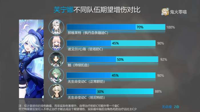 想要解决以上提出的问题,可以使用6命「芙宁娜」,这个角色可以完美地融入队伍中。但是要为了提升两个老C专门去抽7个up五星,这显然是一个很沉重的代价。如果本来就打算抽取6命「芙宁娜」,那么可以顺便兼顾这些问题。