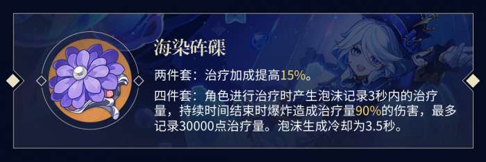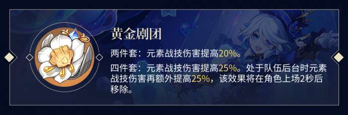 【剧团】4完美契合唯一伤害来源是元素战技、长时间待在后台的「芙宁娜」。相较于生命水伤2+2散件而言,【剧团】套装拥有9个特殊的属性,更为优秀。此外,这套装备还非常实用,可以供多位后台副C使用。圣遗物本的副产物【猎人】套装也是枫丹C和芙宁娜队伍主C的优秀选择,非常值得他们长期刷取。