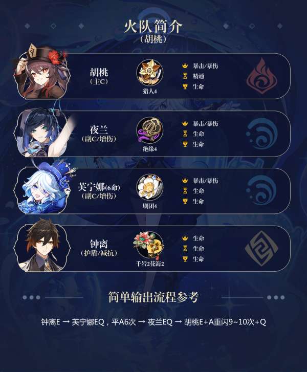 「胡桃」的特点是需要在半血以下才能发挥出自己的天赋技能,并且要求队伍中有一名群体治疗角色。而「芙宁娜」的元素战技只有在自身血量高于一半才能造成伤害并叠加技能效果,因此队伍中需要有较好的治疗保护。如果使用0命「夜兰」进行辅助,则需要注意循环技能的节奏,避免因为节奏过快导致无法抵抗敌方的攻击。而如果队伍已经有了两名水系角色,则需要使用一名治疗角色替换「钟离」来满足治疗需求,并且要注意「胡桃」本身并没有很强的抗击飞能力,容易被敌方强力攻击击飞。因此,在队伍的搭配上,这两名角色并不太适合同时出现。