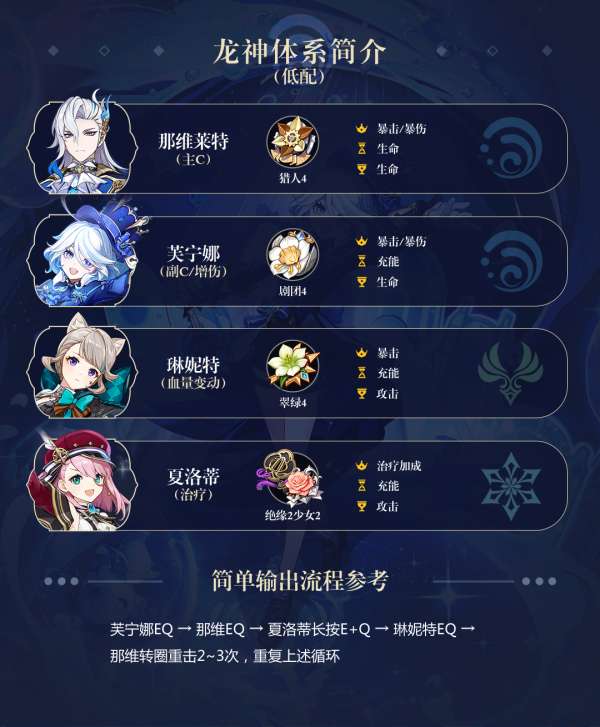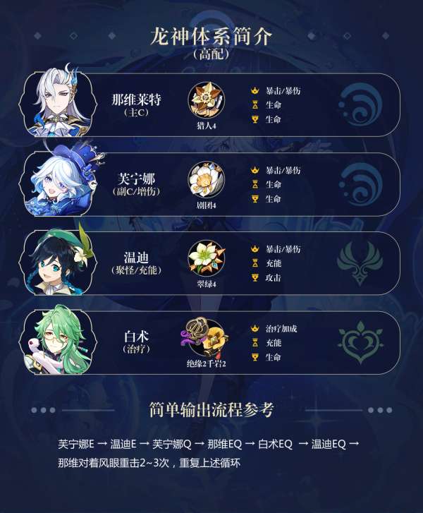 龙神体系是枫丹队伍的版本中最强的组合,通常由固定的「那维莱特」和「芙宁娜」搭配一名风属性辅助和一名群体治疗组成。虽然「万叶」增加的伤害有所稀释,但仍是造成最高伤害的选择。同时,「温迪」和「白术」是使用起来最舒适的辅助和治疗者,前者解决了龙神充能问题,后者则提供了短冷却的群体治疗技能。即使用其他风辅助和治疗者替换它们,伤害差别也不会太大。