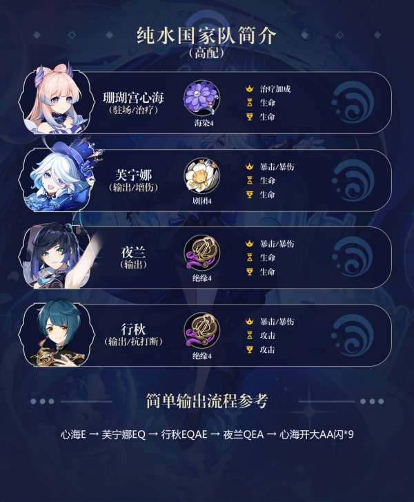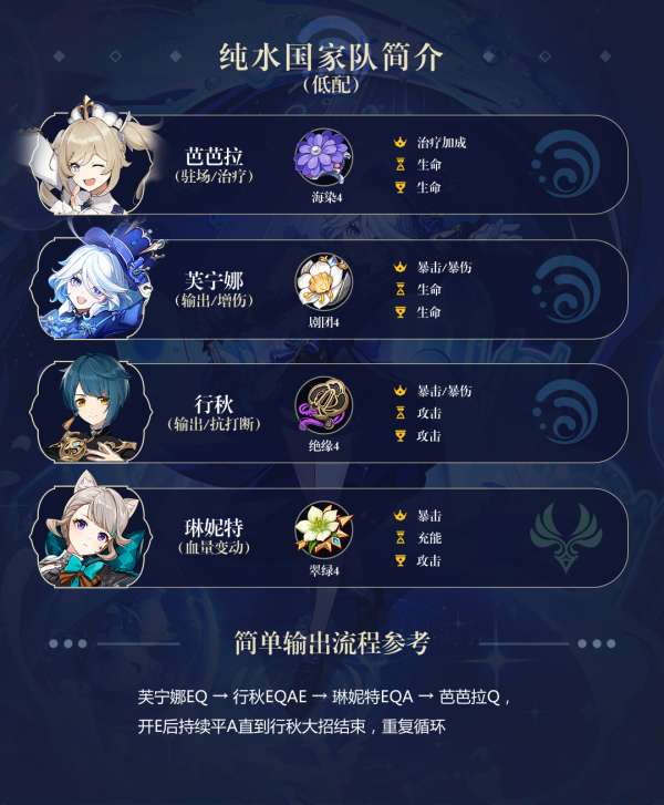 【芙宁娜】是低成本、高泛用性和高数值的多功能增伤辅助。她的大招增加伤害的效果会受到队伍血量变化的影响,并且可以将过量的无效治疗转化为额外的输出属性。由于她的能力本身并不需要五星武器的支持,所以即使是0+0的配置也能够轻松地使用这个角色。
