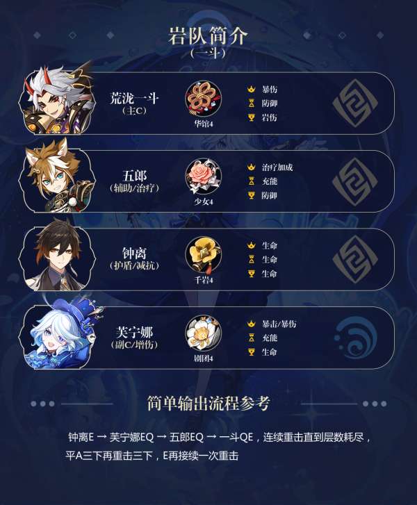 「芙宁娜」可以大幅度提高主打重击的「荒泷一斗」的伤害输出,但「一斗」本身缺乏生命恢复技能,岩队也没有后续治疗,只能依靠高品质的「五郎」或携带【试做金珀】的「凝光」来勉强维持生命值。个人建议保留「钟离」,尽可能升级「五郎」,来满足「芙宁娜」的治疗需求。一方面,岩盾在防御方面的抗性要比脆皮C更高。另一方面,无论是【金珀】还是「五郎」的治疗能力都难以保证「一斗」在面对压力和「芙宁娜」双重伤害的情况下保持生命值平衡。 「钟离」可以为「一斗」提供无与伦比的安全感,稳定的双岩共鸣效果和额外的减抗作用。如果在将来的版本中出现专门的岩奶类角色,则可以考虑将「钟离」替换掉。