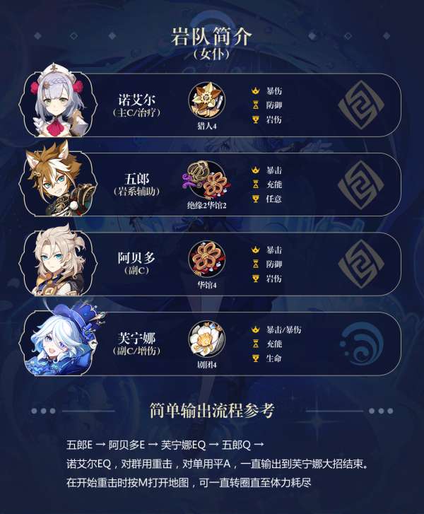 众所周知,岩队最缺乏的就是增加伤害的能力。而「诺艾尔」是一个老牌主C,完美地适应了这种需要,在机制上也完美地与「芙宁娜」的增益效果契合。即使没有其他奶妈的情况下,「诺艾尔」也能够满足「芙宁娜」的治疗需求。如果将0命的「芙宁娜」入队,那么全队DPS的提升率将达到33%,而如果是2命的,则可以达到惊人的86%。同时,「诺艾尔」还可以用范围更大的重击来对付群怪,并将圣遗物替换为更容易堆出毕业面板的【猎人】套(如果已经有了高分【华馆】则不用换)。总的来说,「诺艾尔」是一个非常优秀的团队角色,能够为整个队伍带来很大的帮助。