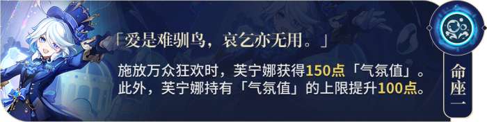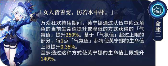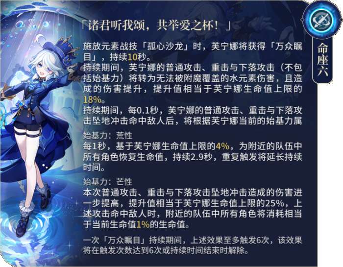 核心命座,巨额加快增伤叠层速度,进一步提高「芙宁娜」的泛用性。如果玩家拥有0到1命,需要与搭配有持续扣血和治疗的角色组队才能在技能释放前就叠满;如果有2命,几乎可以与所有老角色组队快速叠满。这项技能可以提高自身伤害70%,相比于只有1命时,可以为全队带来约20%的提升。