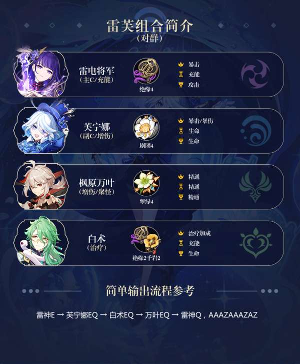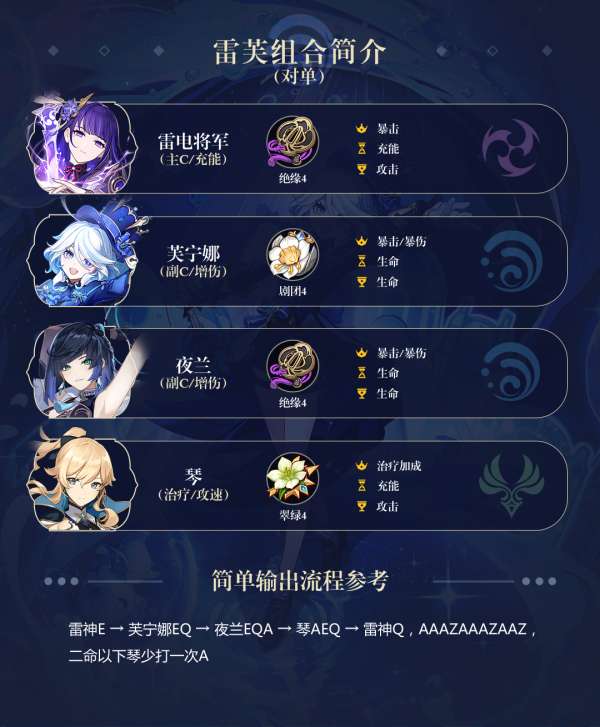 「雷夜琴」队伍是以「雷神」和「芙宁娜」的组合为基础的变种队伍。相较于传统的「雷九万班」和「雷神国家队」,该队伍最大的优势在于放弃了不方便的画地为牢和内鬼火,充分发挥「雷神」霸体输出、高机动性以及大范围追击的特点。同时,作为副C入队的「芙宁娜」还能帮助「雷神」解决Q战士收尾的问题。虽然伤害并没有显著增加,但使用体验却有质的提升。