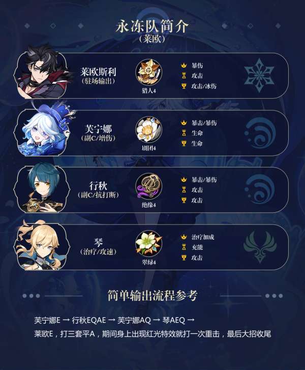 作为枫丹烧血主C,「莱欧斯利」可以快速积累【气氛值】,并且他的永冻驾驶员玩法与「芙宁娜」组队非常适合。融化流的「莱欧」一般不考虑,因为水元素会干扰挂火效果。