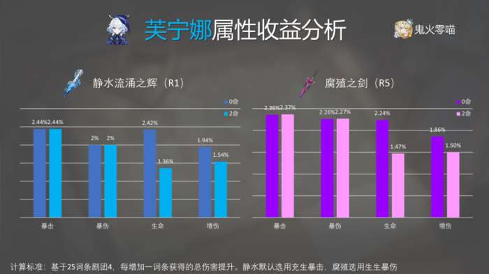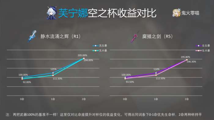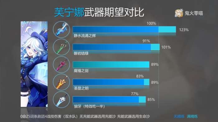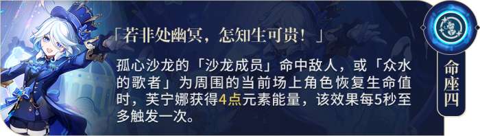 40%的充能效率等价于减少芙宁娜对充能武器的需求。从这个命座开始,可以考虑使用专用武器。但是,在四个命座中使用回能非常尴尬,因此不建议专门为此抽取武器。
