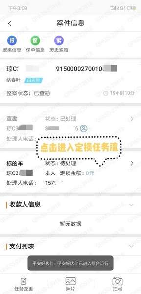 7、案件初始页面可查看案件的报案信息,保单信息,历史索赔等。此环节点击图片所示的标的车/三者车任务流,就可以开始定损咯!