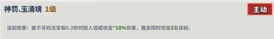 描述:姜子牙的法宝每0.2秒对敌人造成攻击*10%伤害,最多同时攻击3名目标。