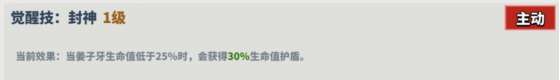 描述:当姜子牙生命值低于25%时,会获得30%生命值护盾。