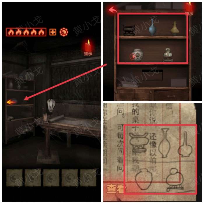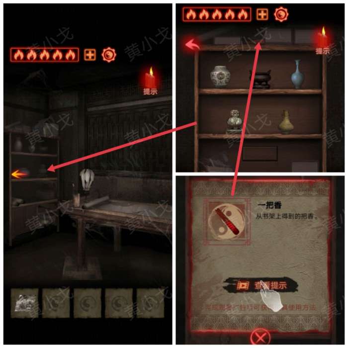 26.(大厅)在桌子上获得【红烛】,在瓶子里获得【枝条】,在门后边获得【陶碗】