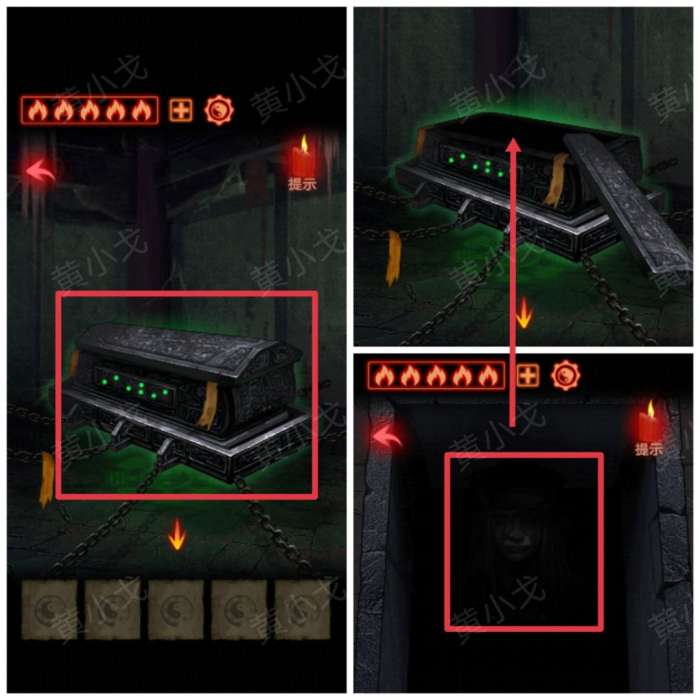 32.(密室)点击石棺上的机关,根据日记上的线索(始于下一,上二下三;上四下四,下五上六;孔孔相连,可破符咒),按顺序按下按钮