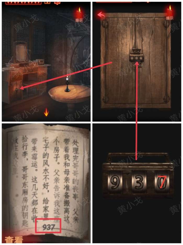 7.点击梳妆台左边的柜子,根据日记上的线索,输入密码:937