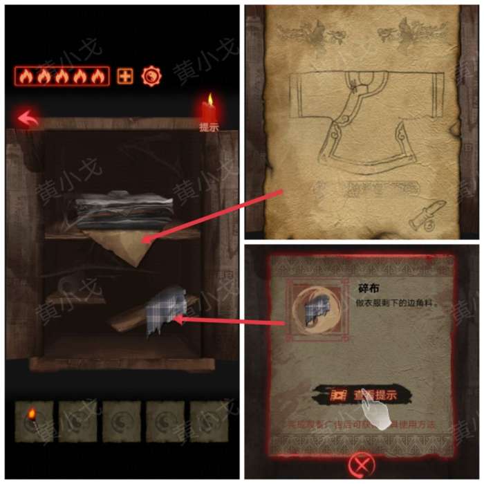 8.打开柜子,获得【碎布】。注意看黄色羊皮卷上的线索(口红-3)