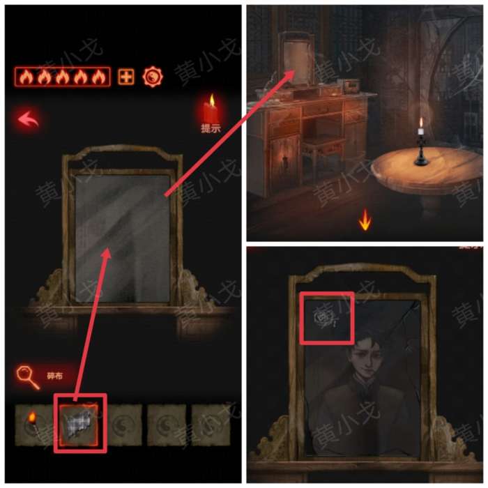 9.点击梳妆台的镜子,用【碎布】擦掉上面的灰尘,获得线索(带花的首饰盒-1)