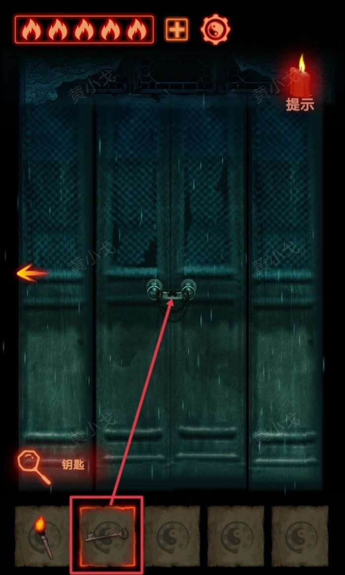 1.(门外)点击挪开右边的石墩,点击拾取石墩下面的【钥匙】