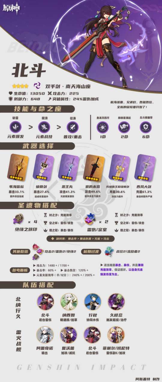 ④北斗更推荐在搭配双雷阵容,充能效率推荐在200%-240%之间,套装优先考虑「绝缘之旗印」4件。