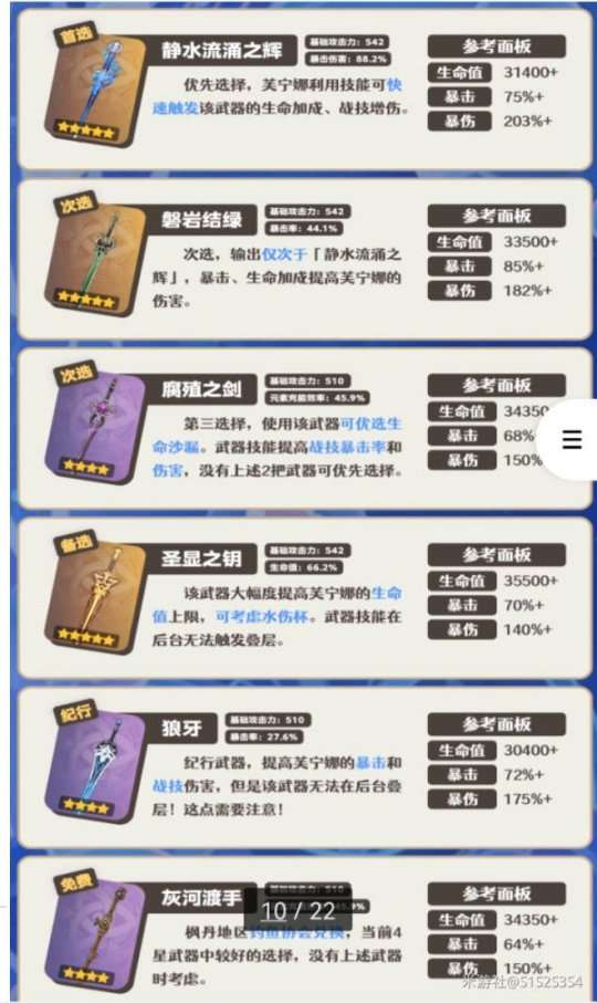 ①输出武器的次选,与「静水流涌之辉」的差距最小。副属性暴击率加成降低芙宁娜的暴击率需求,此时圣遗物可以优先考虑堆叠暴击伤害、百分比生命加成。