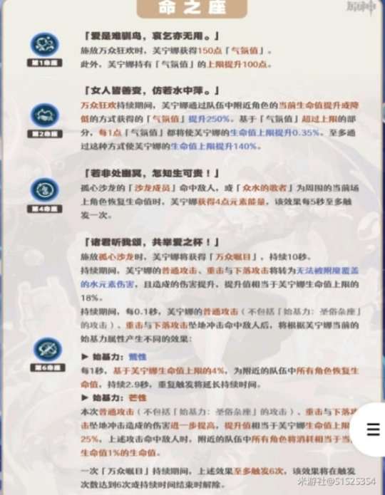 ◆芙宁娜的关键技能和机制主要集中在元素战技和爆发中,因此在尚未获得6命之前,玩家可以选择不升级该技能。即使在获得6命后,升级该技能的效果也不是很明显,因为6命额外增加的生命倍率已经足够。相比之下,提升普通攻击的效果很小,不建议将太多资源用于升级普通攻击。
