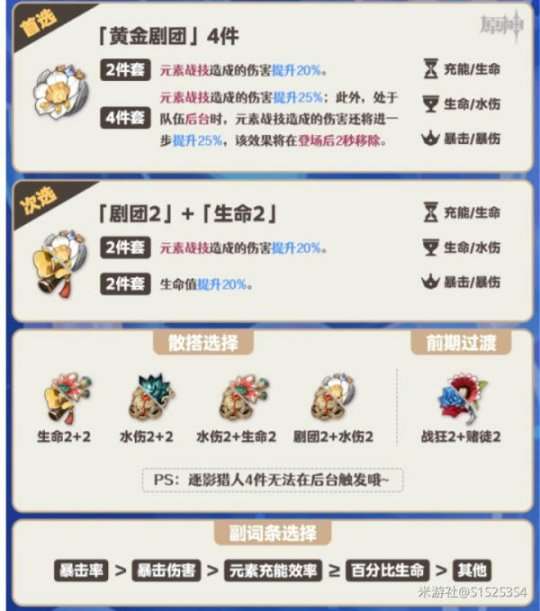 ①芙宁娜处于后台时荒性战技造成持续水伤,在大多数情况下都可考虑「黄金剧团」4件套提高元素战技造成的伤害。
