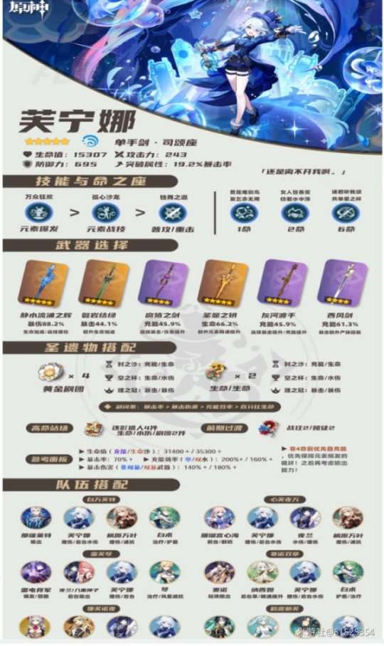 ③三水阵容时,0命夜兰的充能在190%左右、1命夜兰的充能在150%左右即可;芙宁娜的充能效率在140-150%之间即可。