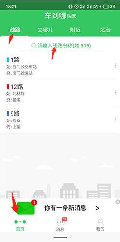 1、打开软件,点击底端的“首页”选项,然后点击顶端的“线路”选项,然后输入想要查询的公交车线路,比如1路。