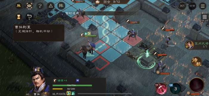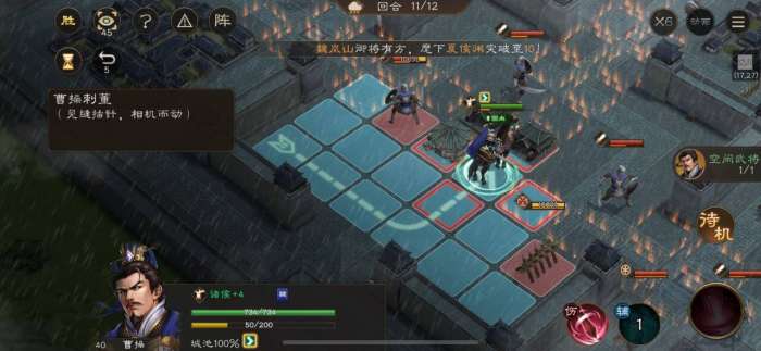 这关比较考验走位,第一回合,曹操往上走,开辅助技能加速。