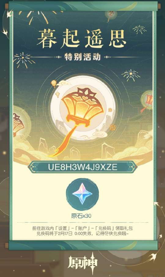 除了以上这些新内容之外,玩家最关心的肯定还是春节时期的版本活动福利了。在本期海灯节期间登录游戏输入下方兑换码即可领取璃月伙伴们赠送的海灯节礼物哦~