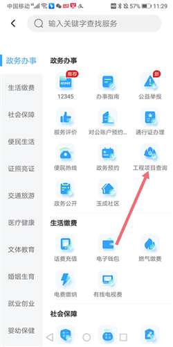 2、在打开的新页面中,找到政务办事子项中的【工程项目查询】点击