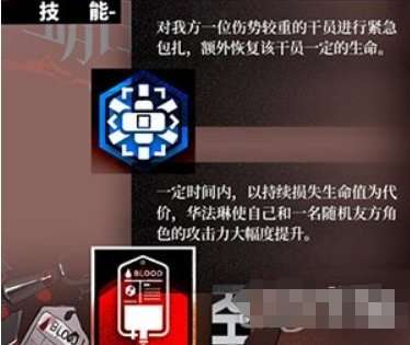 初始技能“紧急包扎”可以消耗普通攻击时获得的技力点来增强自己的治疗能力。下一次治疗时,会对血量低于50%的单位进行治疗,并附带一定百分比的被治疗单位总血量恢复。第二技能“不稳定血浆”可以大幅度提高自己和攻击范围内一名干员的攻击力,但需要承受持续损失生命值的代价。