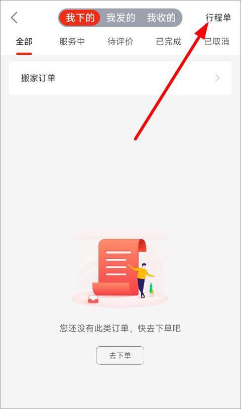 3、打开订单页面,可以看到我下的订单、我发的订单以及我收的订单,点击右上角行程单;