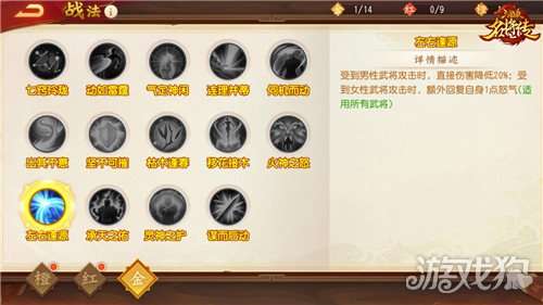 左右逢源——受到男性武将攻击时,直接伤害降低20%;受到女性武将攻击时,额外回复自身1点怒气;