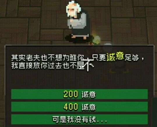 首先他会需要你的“诚意”,也就是金钱,选择上两个选项选择200诚意不清楚,可能是概率不攻击你,选择400诚意则可以贿赂boss,直接跳过这一关boss战,当然你也会损失金钱,打打boss他不香吗?