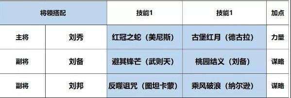 2、阵容特点:此阵容可享受阵营加成,全属性+10%。有两者初始兵种为步兵,可享受器械盾牌加成,全属性+20。刘邦和刘备自带技能能够提高刘秀对敌造成的伤害,技能契合度高。且刘备还能够提供一定的治疗效果,队伍续航能力强。