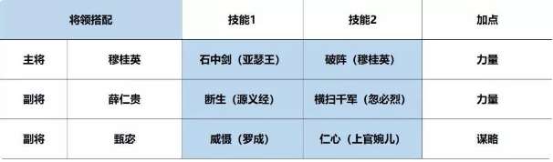 3、技能搭配:此阵容中的穆桂英和薛仁贵为主力输出位置,因此需要搭配物理输出型技能。甄宓自带技能不具备治疗、减伤等效果,因此考虑为其搭配具有治疗效果的技能,从而提高队伍整体续航能力。