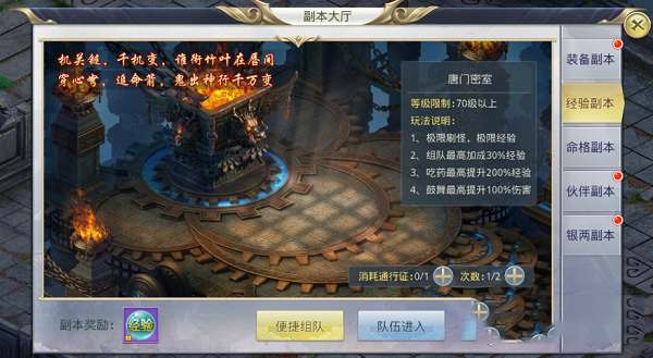 初期跟着主线任务走,很轻松就可以达到70级,然后点击副本-经验副本,就可以打开经验副本界面,有单人进入和队伍进入两种方式,其中组满3人队伍会有额外30%经验加成,想要高经验的玩家一定要组满强力队友。