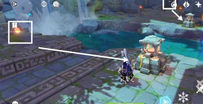 继续向前,铁门旁有一个调查,接着水上有一块石台,利用石台上去。